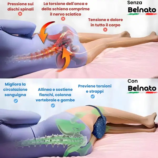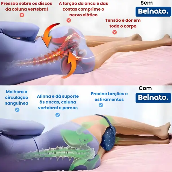 Colocar a Almofada Ortopédica Belnato™ entre as pernas corrige o desalinhamento, reduz a dor e protege o nervo ciático da compressão.